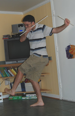A piece of this tent has another use. He takes the poles out and detaches one section and pretends like it is a microphone. He requests Rocknoceros and we all jam out.
